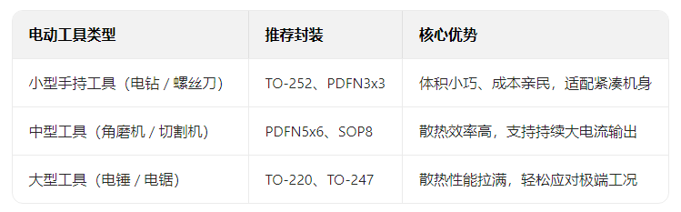 固得沃克产品推荐:固得沃克提供多种封装选项,包括适用于小型工具的TO-252封装,和适用于中大型工具的SOP8、TO-220、TO-247